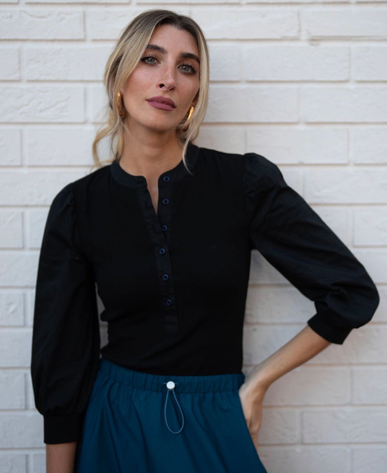 These tops are super chic—structured yet soft, with that button-down detail and slight puff sleeve. They give off an elegant, tailored, modest vibe but with a modern twist