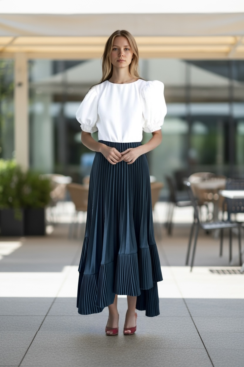 Elevate your silhouette with this statement pleated midi skirt, designed with an asymmetrical hemline and layered pleats that create graceful movement with every step. Crafted from a flowy fabric in a deep midnight teal hue, it pairs effortlessly with structured blouses or soft knits for a timeless, feminine look.