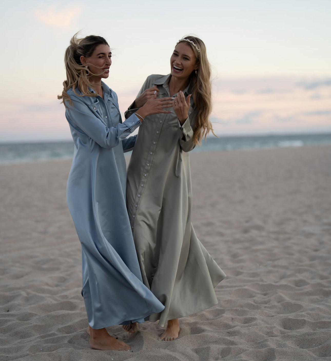 Satin Belted Maxi Dress, Steel Blue – Olivvi World
